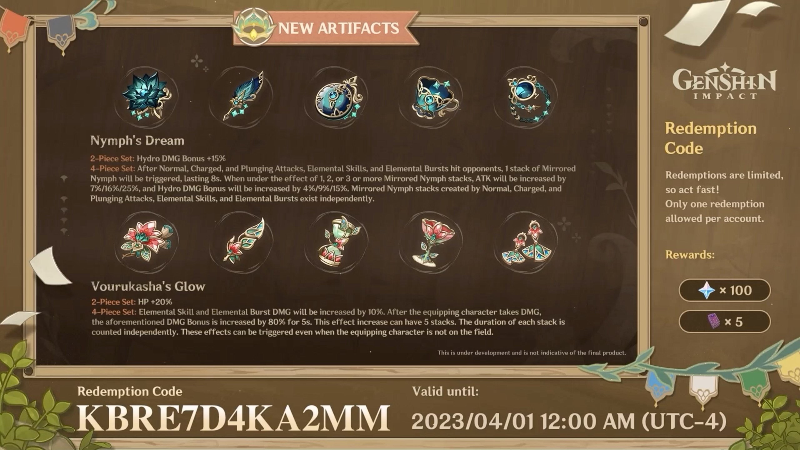 , le catalyseur Splendeur de l’azur qui sera l’arme recommandée pour Baizhu et deux nouveaux sets d’artefacts nommés : Rêve de la nymphe et Lueur de