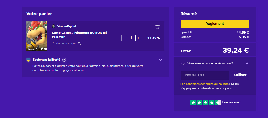 La première et principale raison d’acheter une carte-cadeau Nintendo de 50 euro sur Eneba, c’est tout d’abord parce que la carte est au petit prix de 42.43 € avec le code