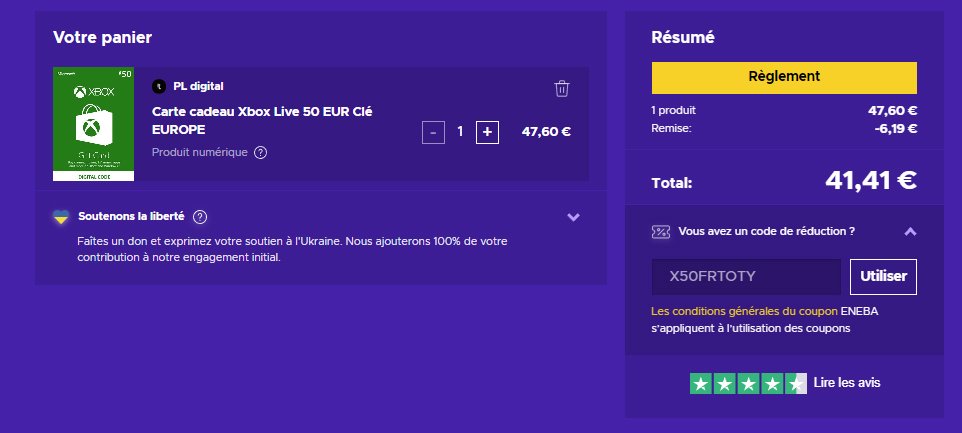 La première et principale raison d’acheter la carte Xbox Live de 50 € sur Eneba, c’est tout d’abord parce que la carte est au petit prix de 41.86 € avec le code MARSPRING.
