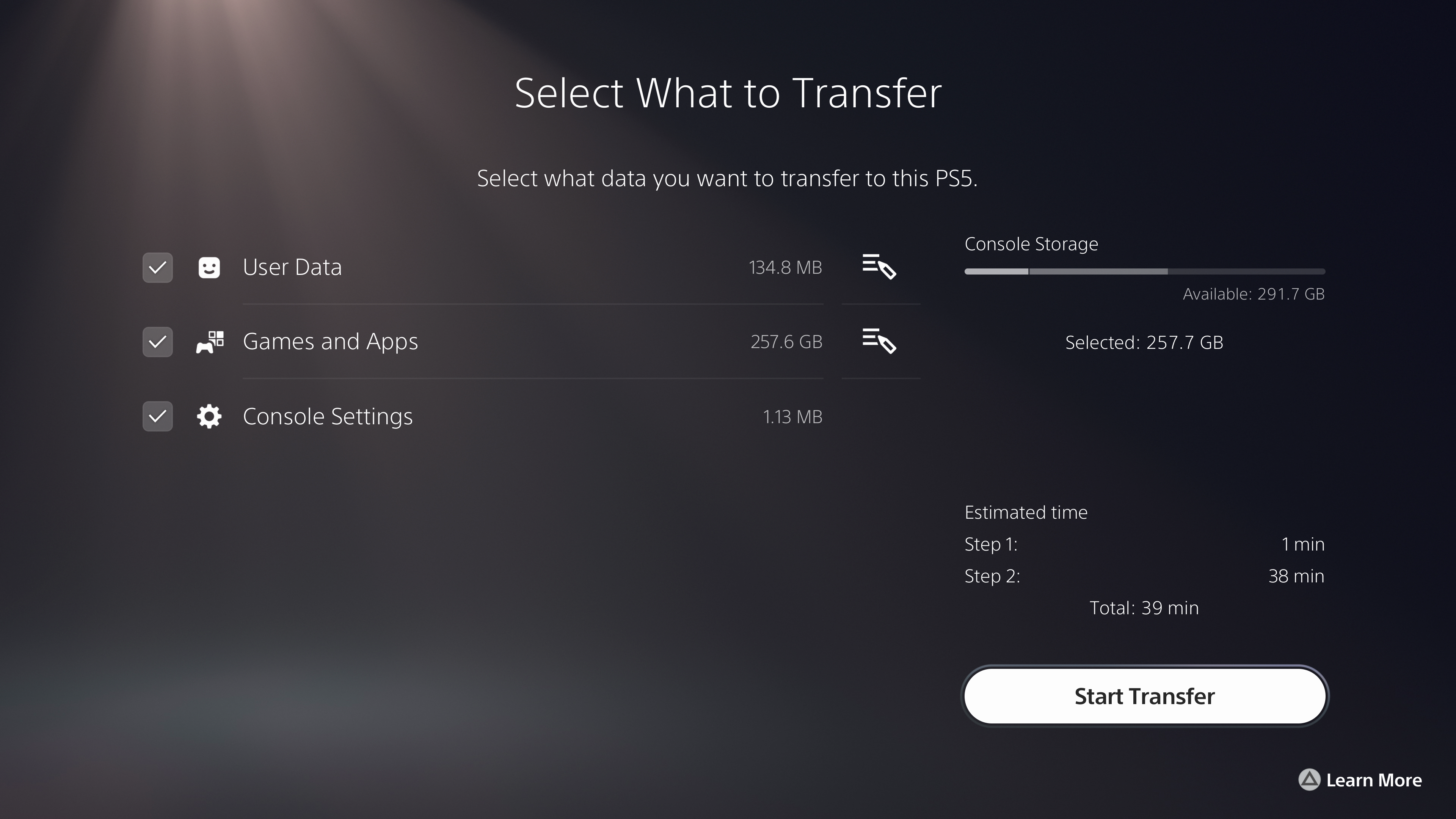 joueurs de transférer facilement les données de leur console PS5 vers une autre console PS5 en passant par un réseau Wi-Fi ou un câble LAN. Il est également possible de mettre à jour le logiciel