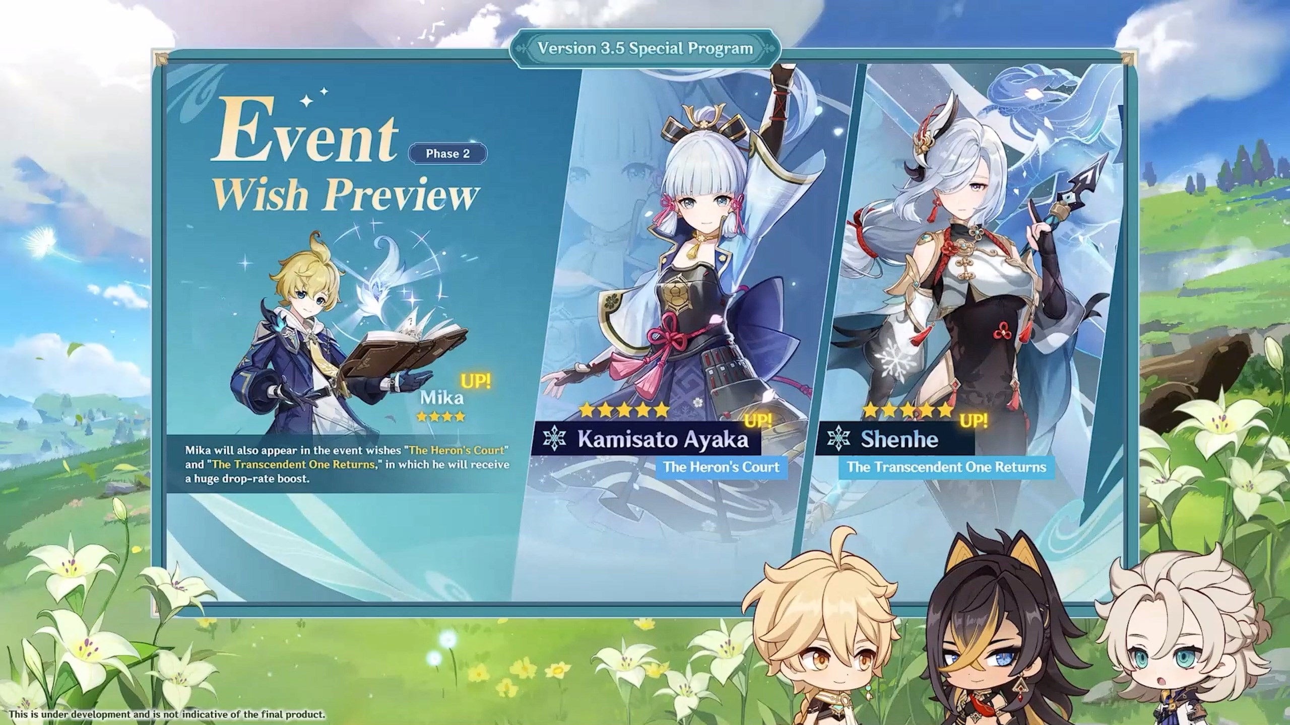 Ayaka et Shenhe seront les deux personnages 5 étoiles mis en avant dans la seconde phase des bannières du patch 3.5 avec Mika (crédits : miHoYo)