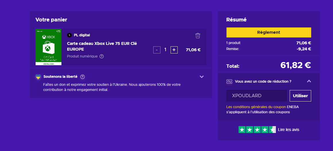La première et principale raison d’acheter la carte Xbox Live de 50 € sur Eneba, c’est tout d’abord parce que la carte est au petit prix de 61,82 € avec le code