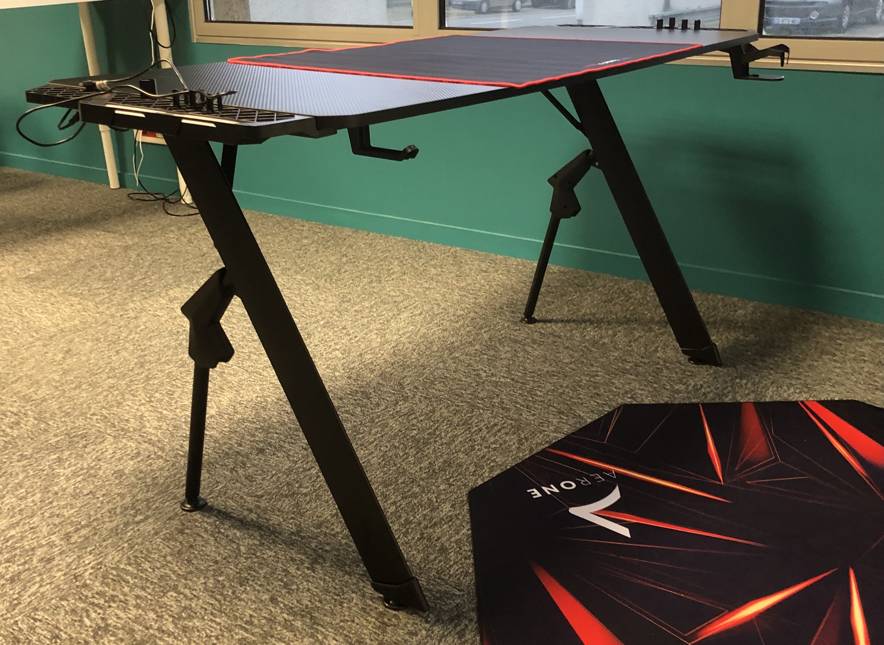 mais aussi des fixations pour mettre des enceintes sur les côtés. Autre détail, et non des moindres : la table est fournie avec un tapis de souris tout-à-fait satisfaisant. Les pieds sont en partie