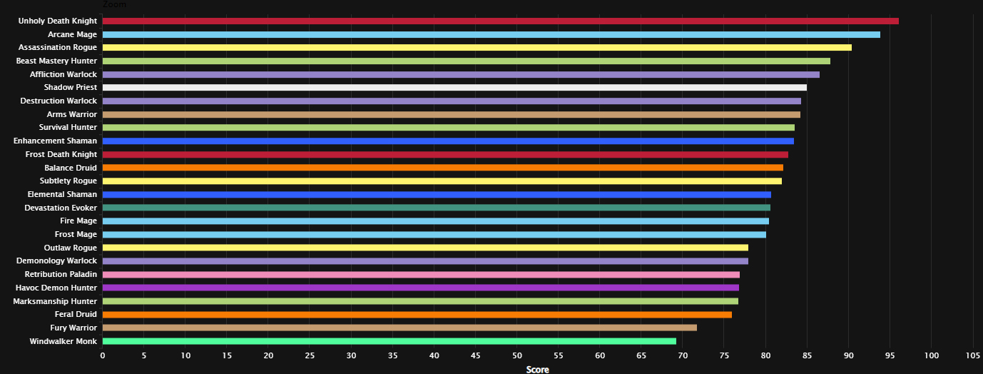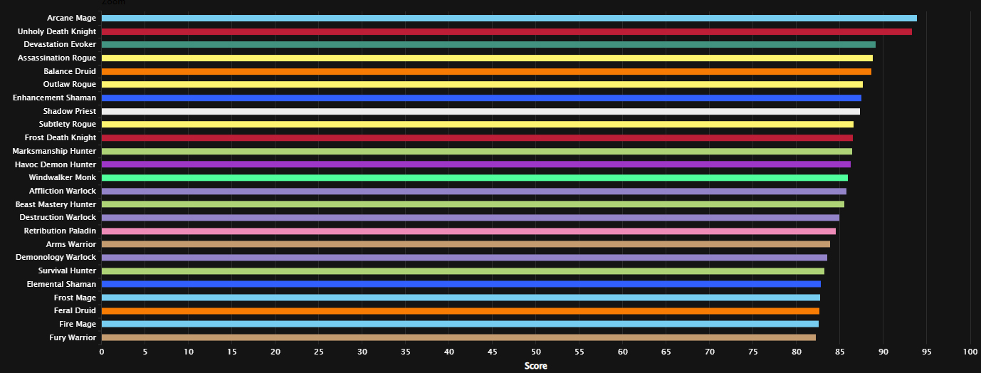 Ce graphique est produit en sélectionnant le 95ᵉ pour centile, en Mythique et en prenant en compte tous les dégâts infligés, ce qui peut encourager à gagner du DPS en