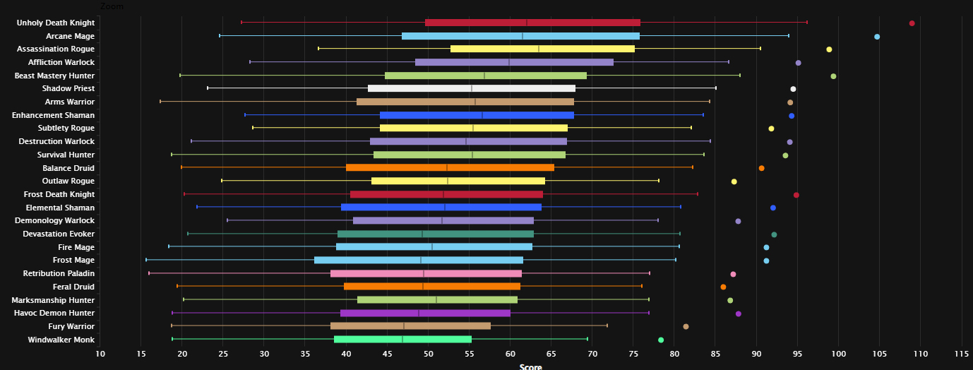 Vous pouvez voir ici des diagrammes en boite pour chaque spécialisation permettant de comparer le résultat DPS de chaque spécialisation selon la performance des joueurs, des parses les plus