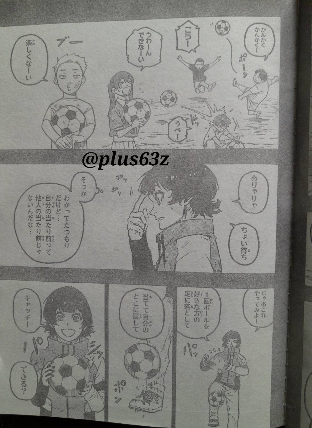 Toujours souriant, Bachira accepte : « D’accord, on va commencer par jongler ! Regardez, il suffit de frapper la balle avec le dessus du pied, comme ça. Tap, tap ! »