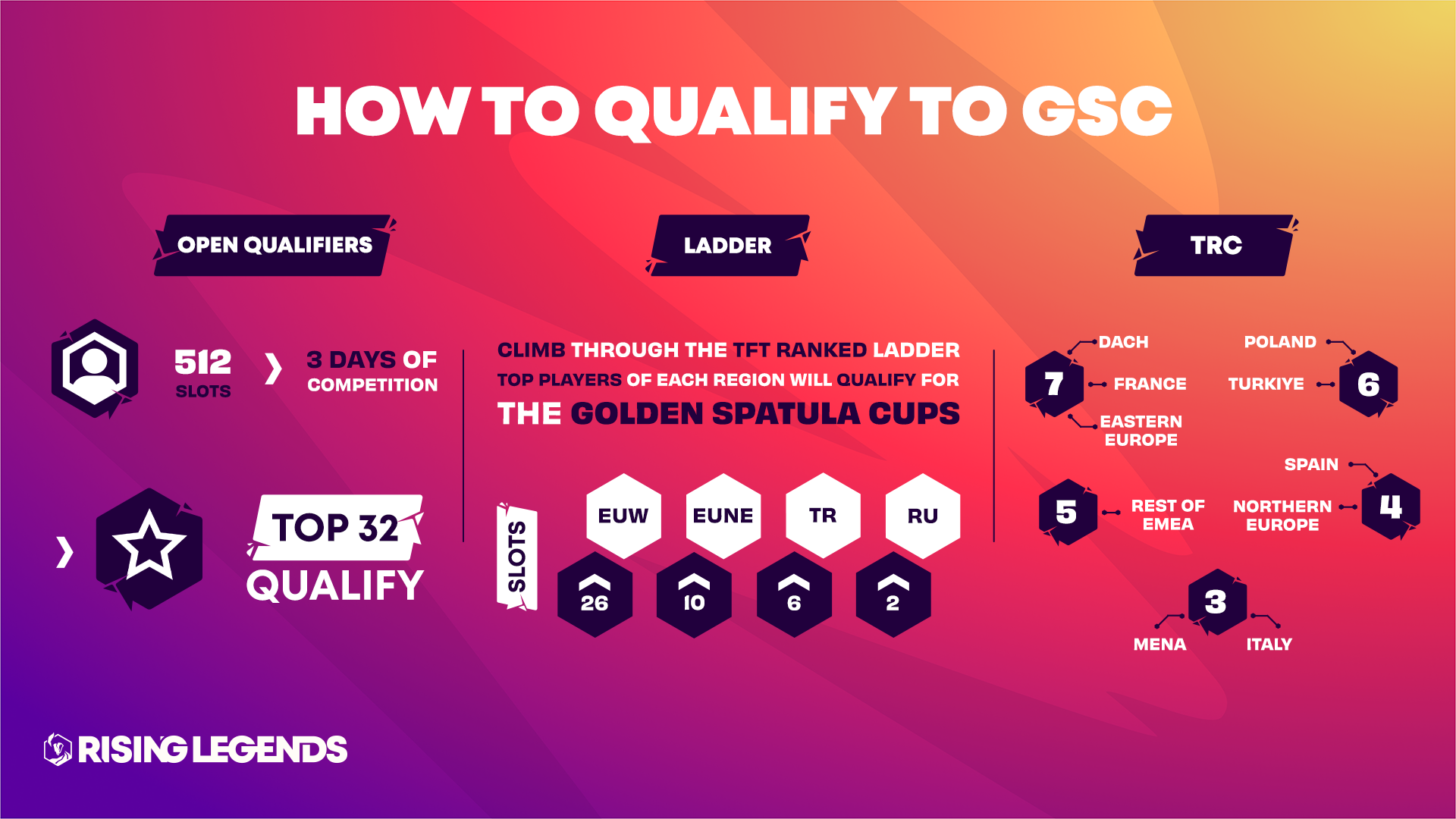 La saison s’achèvera par la finale de TFT Rising Legends, lors de laquelle les 32 meilleurs joueurs des Golden Spatula Cup, du Ladder et des qualifications régionales