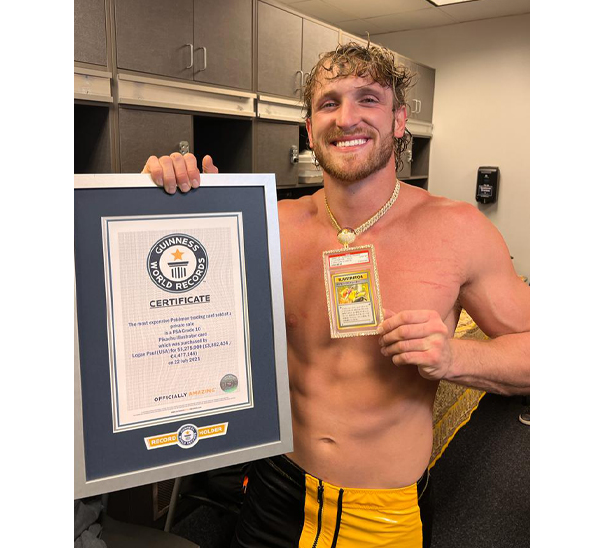 Logan Paul et le certificat du Guinness World Records attestant que cette carte est bien la carte Pokémon la plus chère jamais vendue.