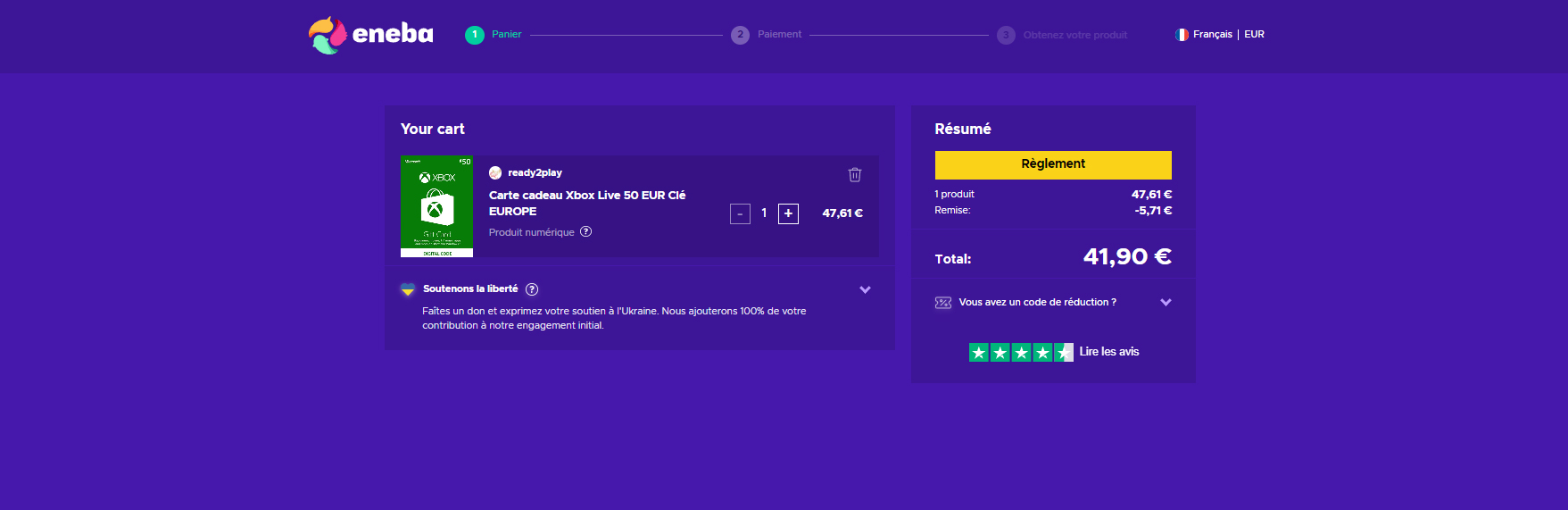 La première et principale raison d’acheter la carte Xbox Live de 50 € sur Eneba, c’est tout d’abord parce que la carte est au petit prix de 41,90 € avec le code XBOXDEC50.