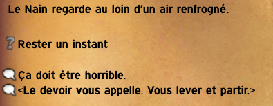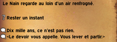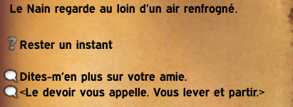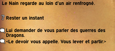 Si vous décidez de partir alors la quête s’arrête là, en revanche si vous restez voici ce que ce mystérieux nain vous racontera :