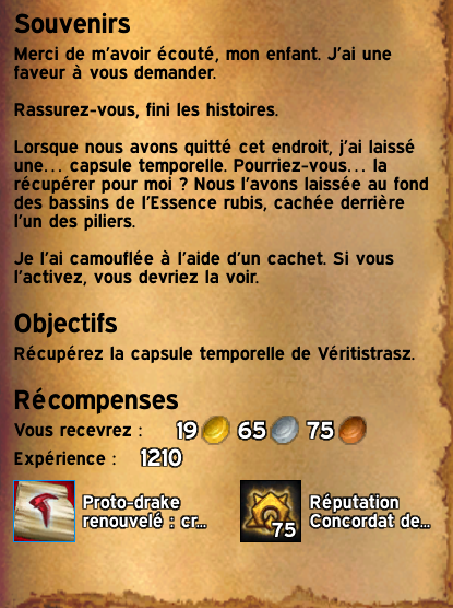Vous récupérez ensuite la capsule temporelle et rendrez la quête à Véritistrasz.