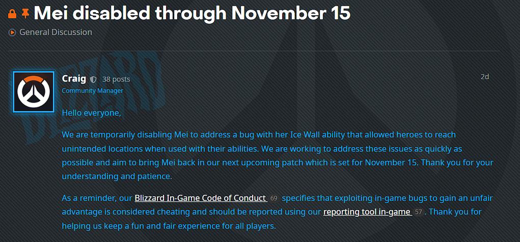 Le message pour expliquer la désactivation de Mei dans Overwatch 2 (crédits : Forums Blizzard)