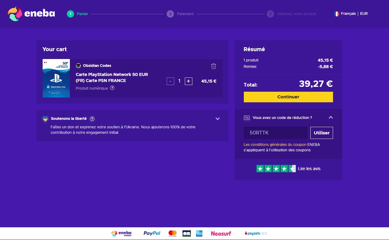 La première et principale raison d’acheter la carte PSN de 50 € sur Eneba, c’est tout d’abord parce que la carte est au petit prix de 39,27 €