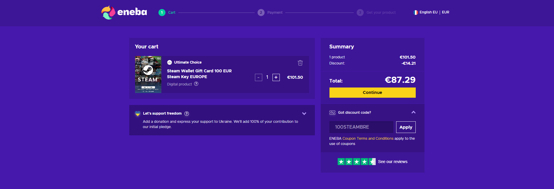 La première et principale raison d’acheter la carte Steam de 100 € sur Eneba, c’est tout d’abord parce que la carte est au petit prix de 87.29 € avec le code