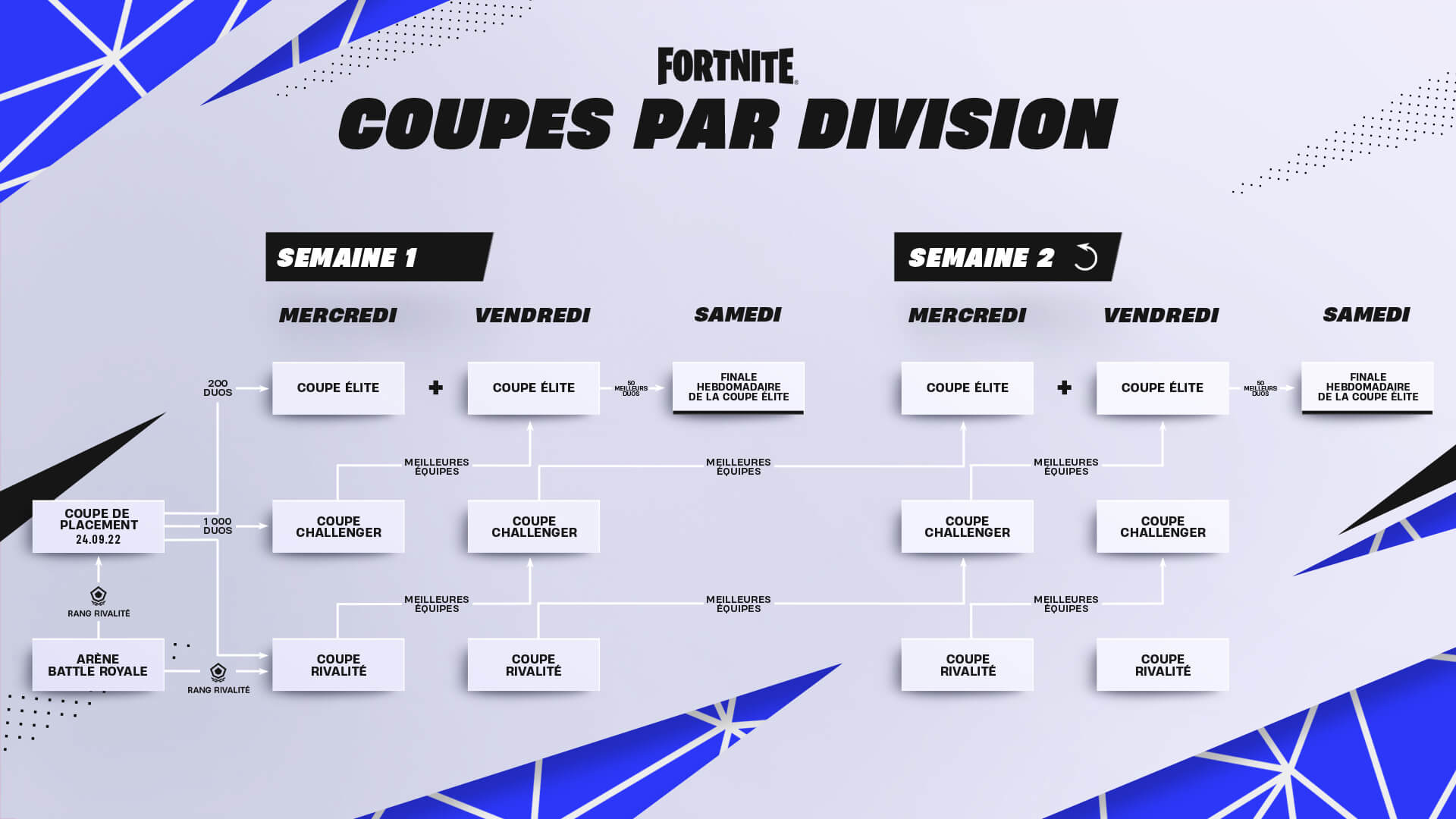 Une nouvelle série de compétitions va être mise en place par Epic Games : des tournois en duo nommés Coupes de division. Tout est résumé en une image ci-dessous, et plus d’informations sont
