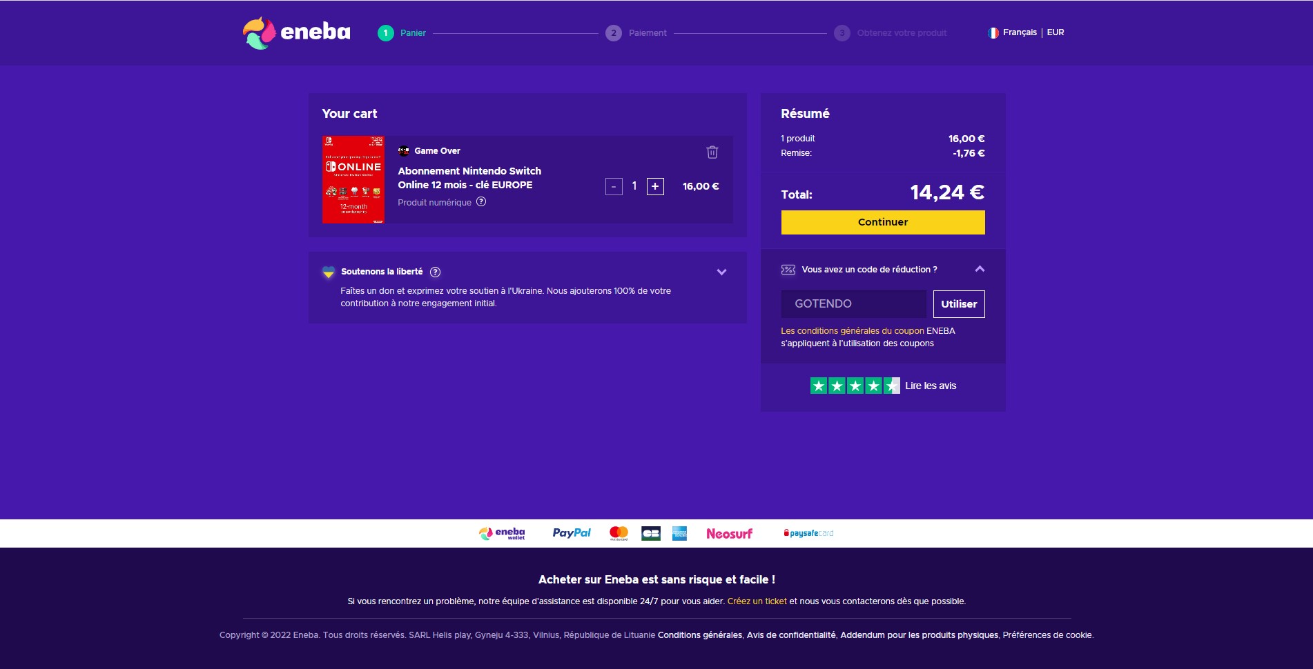 - Déroulez l’onglet « Vous avez un code de réduction ? » et entrer le code « GOTENDO », puis cliquez sur continuer.