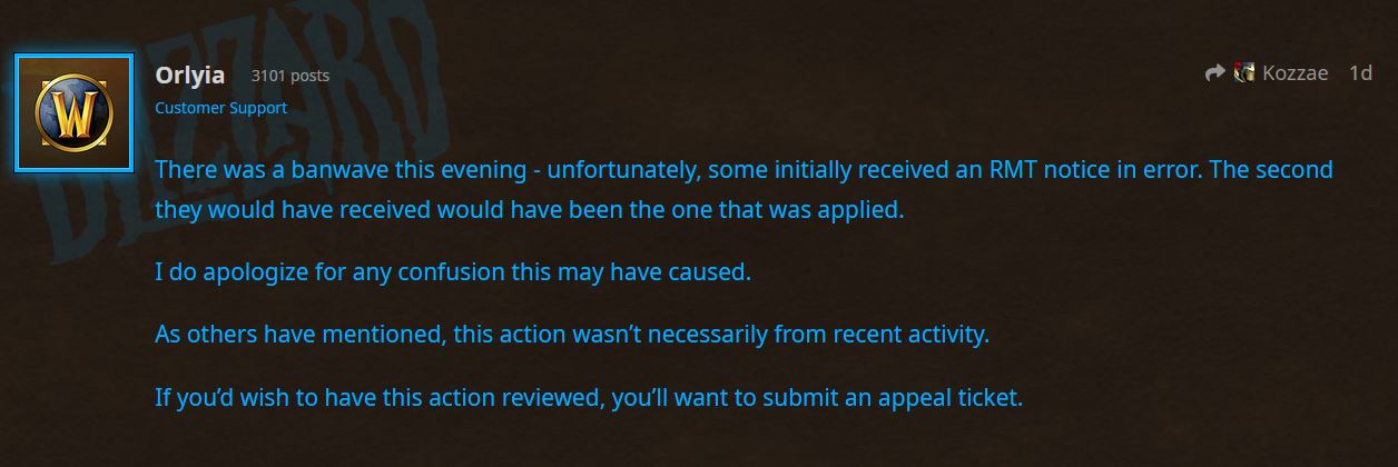 Cependant Blizzard a également déclaré que certains joueurs ont été bannis pour échage de services contre de l’argent réel alors que ce n’était pas le bon motif. Si tel est le cas les joueurs