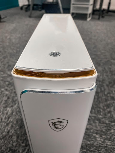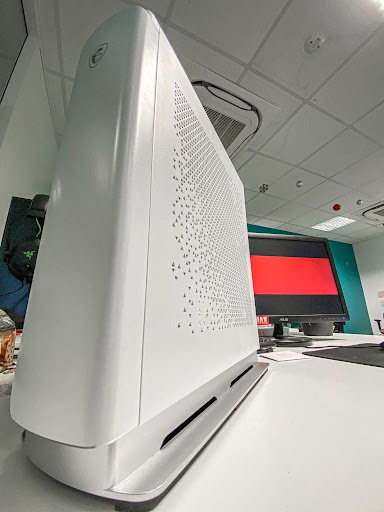Ici, MSI n’a pas seulement livré un boîtier : c’est un véritable objet, visuellement très réussi. Épuré, arrondi, l’aération du capot est très subtile et des décorations en plastique doré offrent à