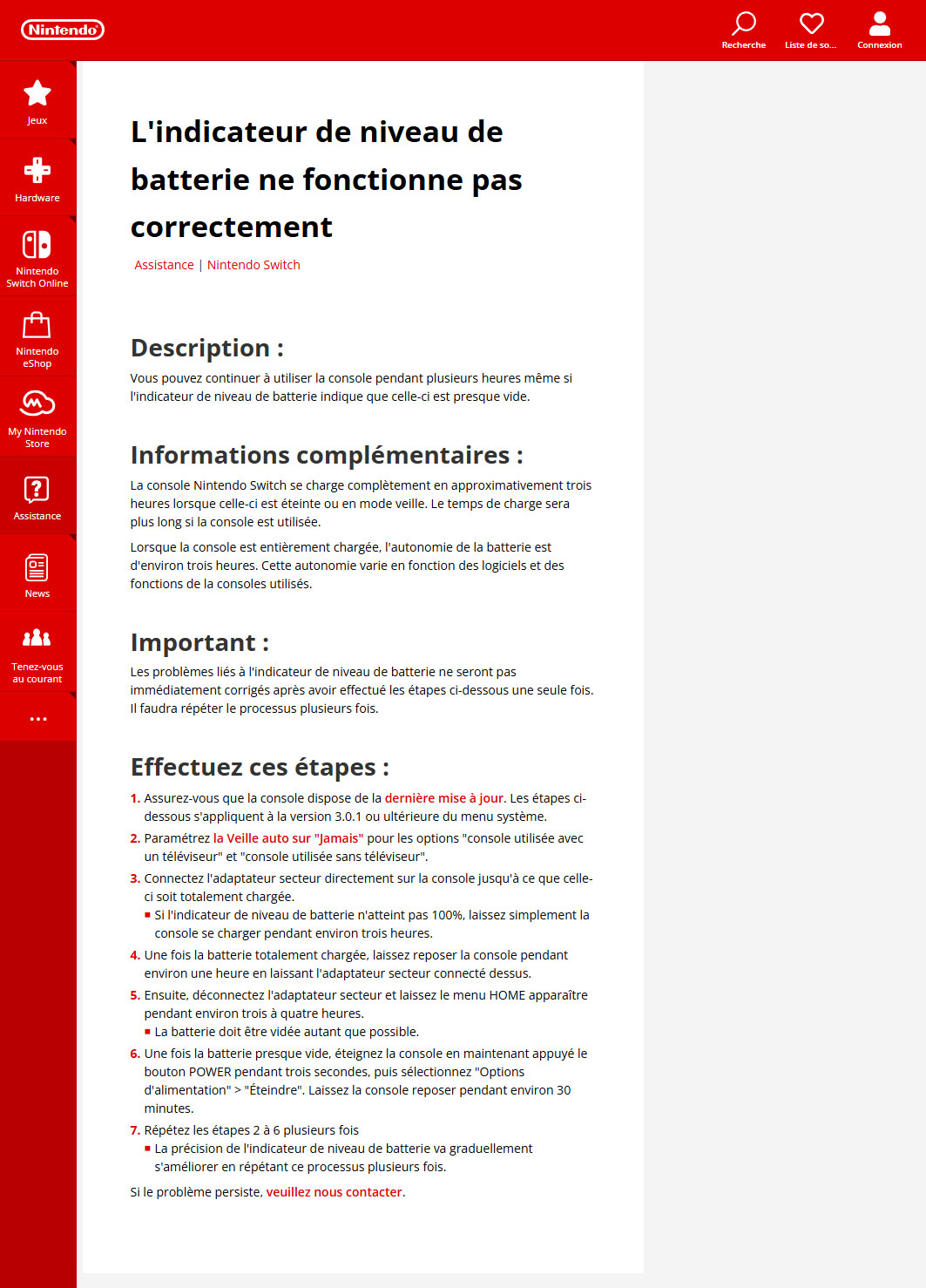 Si vous êtes confronté à ce problème d’affichage (une batterie qui se vide trop vite affichée à l’écran, ou qui reste bloquée à 1% par exemple), Nintendo propose une série d’étapes pour calibrer