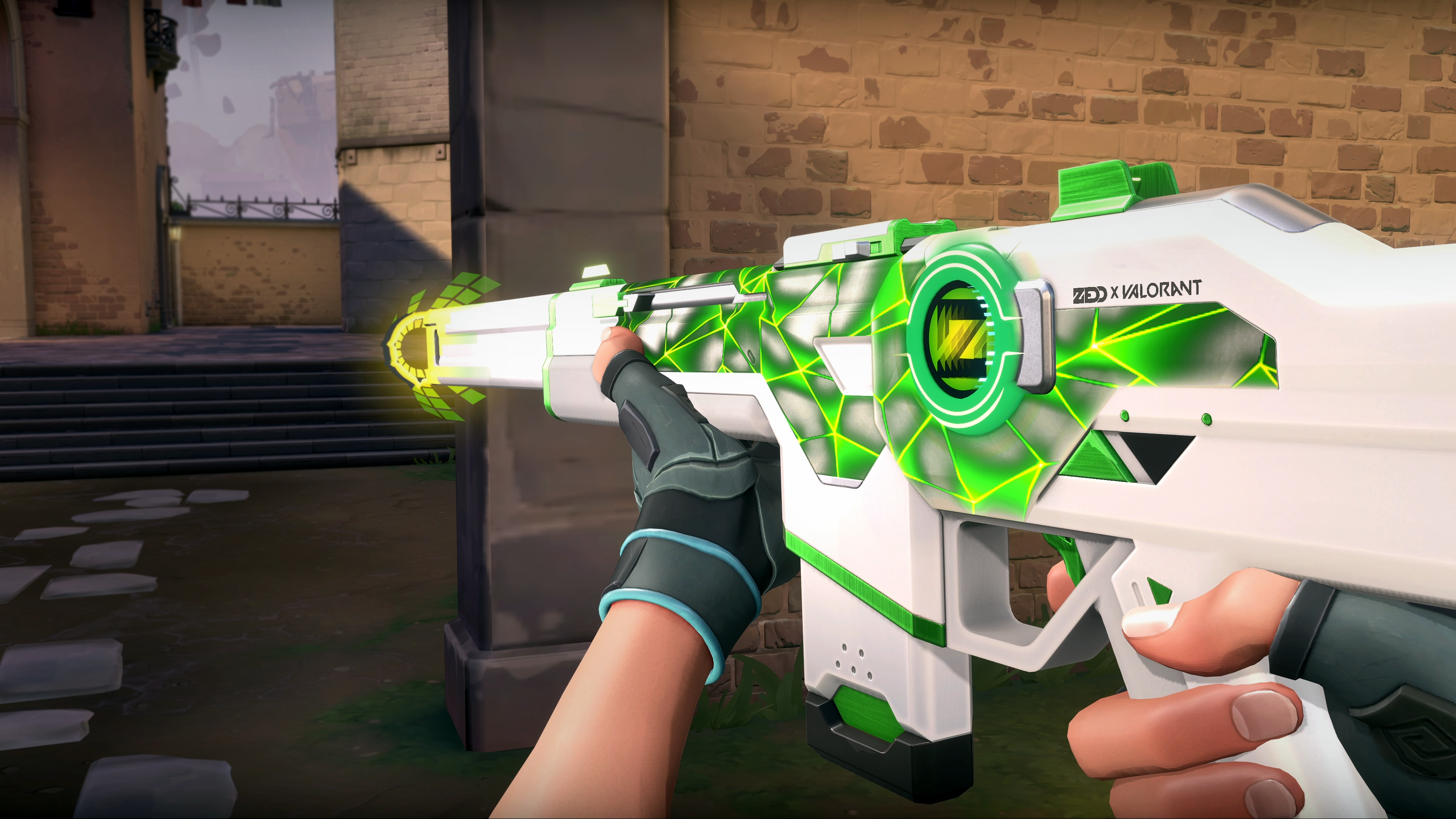 Notez que tous les aperçus ci-dessous montrent les skins sans animations. En augmentant les rangs avec de la Radianite, vous ajouterez des effets sur l’arme (des