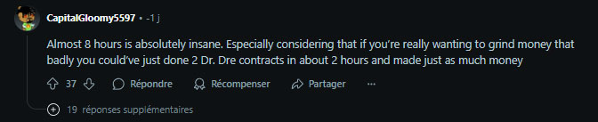 qu’une somme équivalente pourrait être gagnée en environ deux heures en réalisant deux contrats Dr. Dre, des missions bien plus lucratives en temps normal.