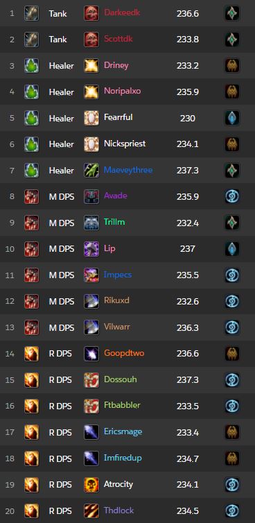 Limit restent sur une base de 5 healers, ce qui témoigne des dégats et des CDs de raid nécessaires dans ce raid. Au tanking le choix s’est porté sur un double DK sang.