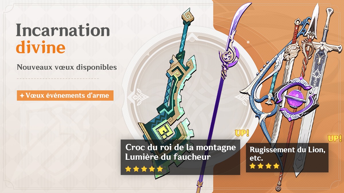 Comme pour la sortie de chaque patch, les armes 5 étoiles mis en avant dans les deux bannières sont celles recommandées pour les personnages 5 étoiles disponibles dans les différentes vagues. Leur