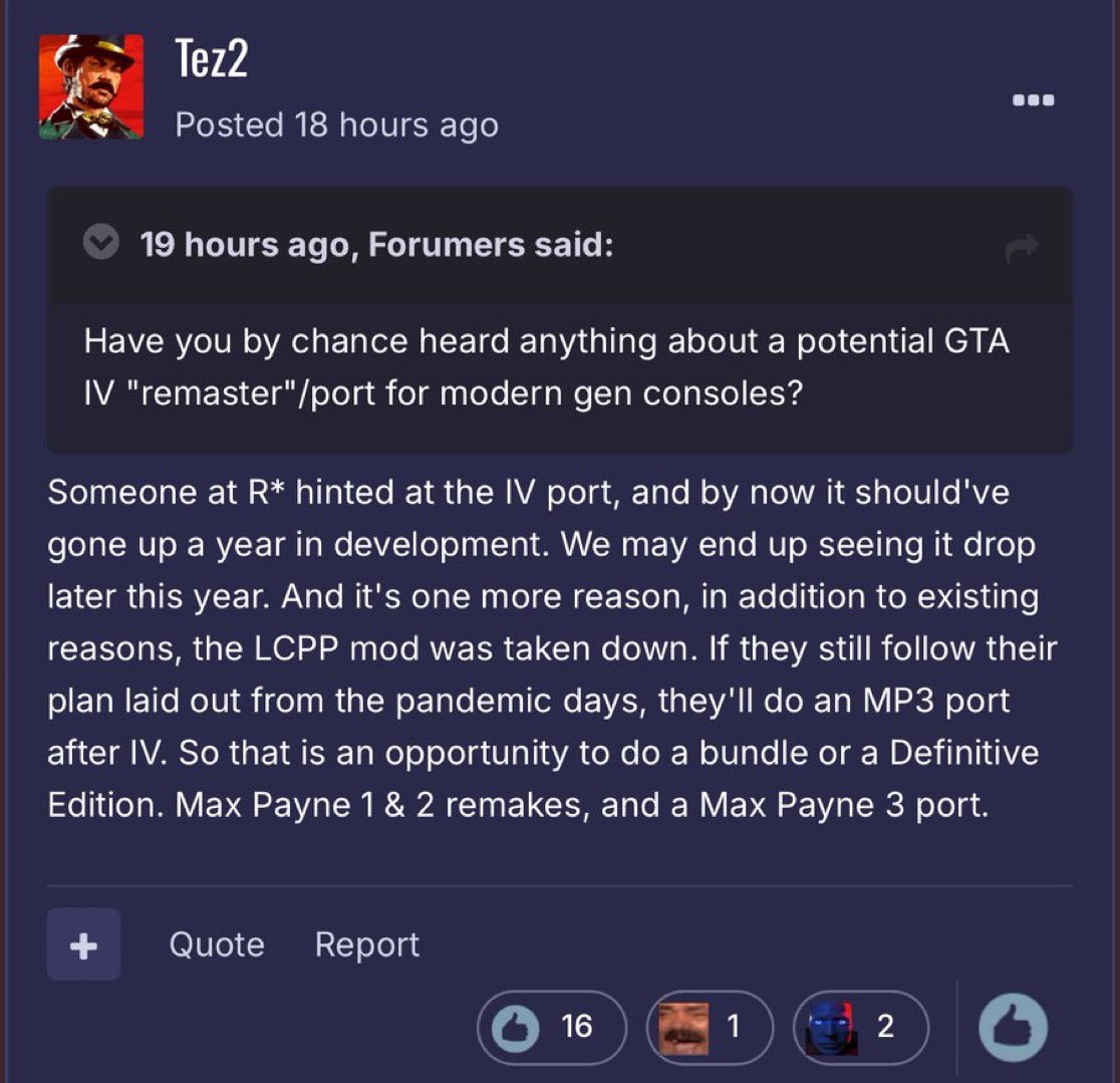 C’est sur les forums GTA, au cours d’une discussion animée autour du trailer de GTA 6, que Tez2 a lâché cette bombe potentielle en répondant à une question sur une éventuelle remasterisation ou un