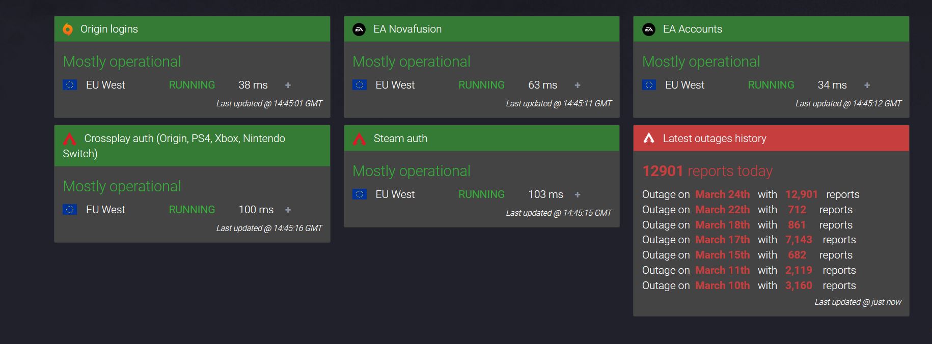 pas impossible que le réseau rencontre quelques imprévus. Pour cela le mieux est de consulter ce site indépendant pour connaître l’état des serveurs d’Apex Legends (lien). Le site officiel d’EA donne également des informations sur l’état des serveurs de ses différents jeux