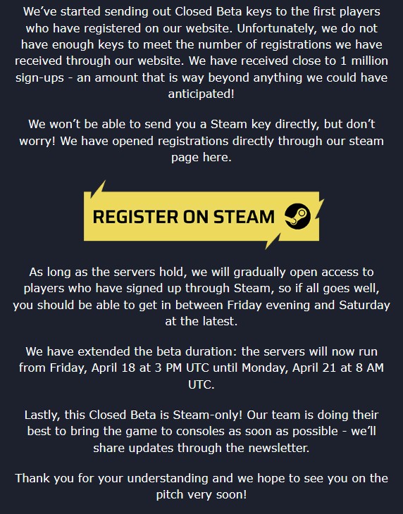 elle se terminera le lundi 21 avril à 10 h en France. Cette date et heure de fin a été donnée directement par les développeurs aux joueurs qui se sont inscrits pour avoir une chance