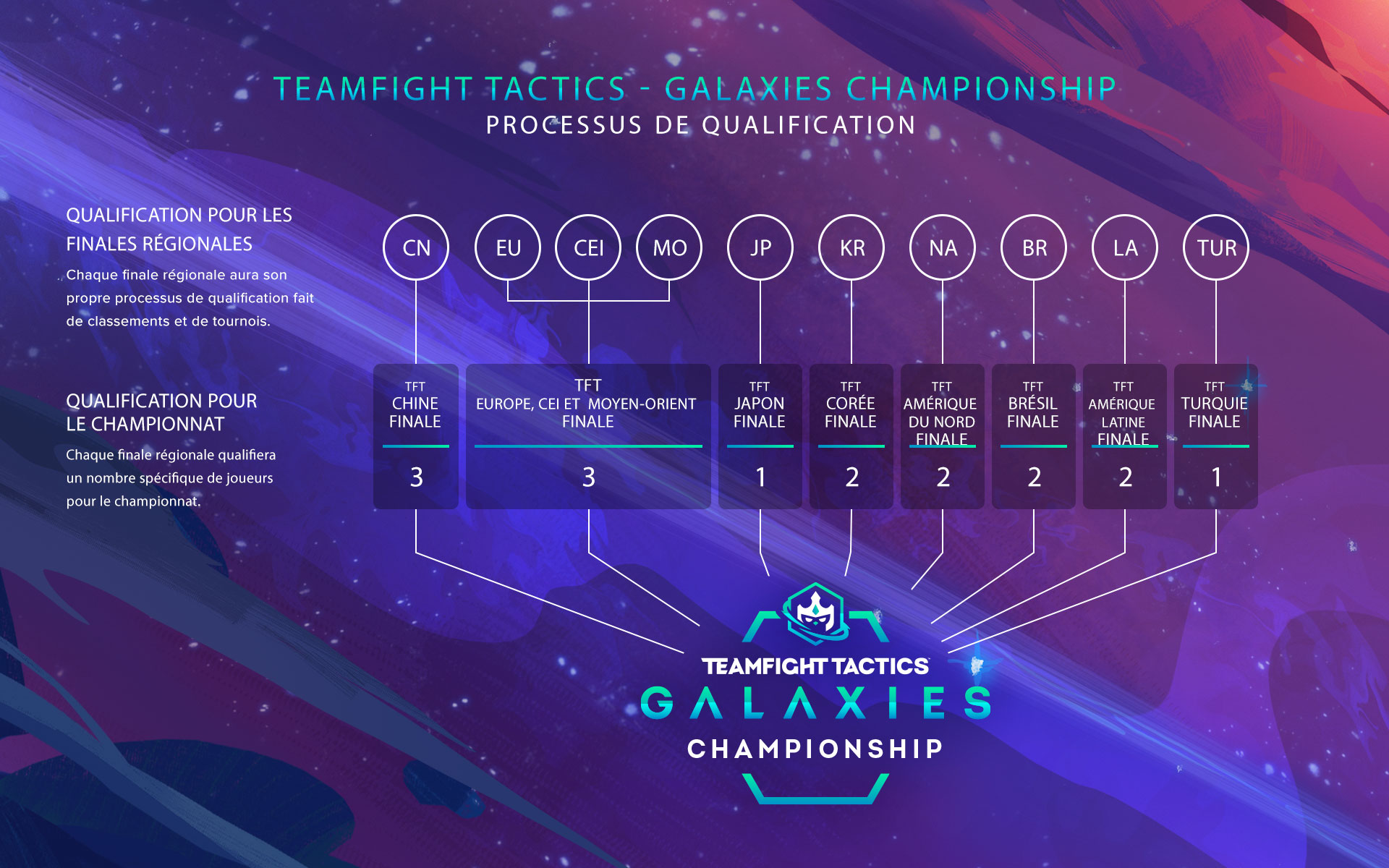 Pour chaque région, il existera un système unique afin de se qualifier pour le Teamfight Tactics : Galaxies Championship. Pour être éligible à ces tournois de qualifications, les joueurs seront