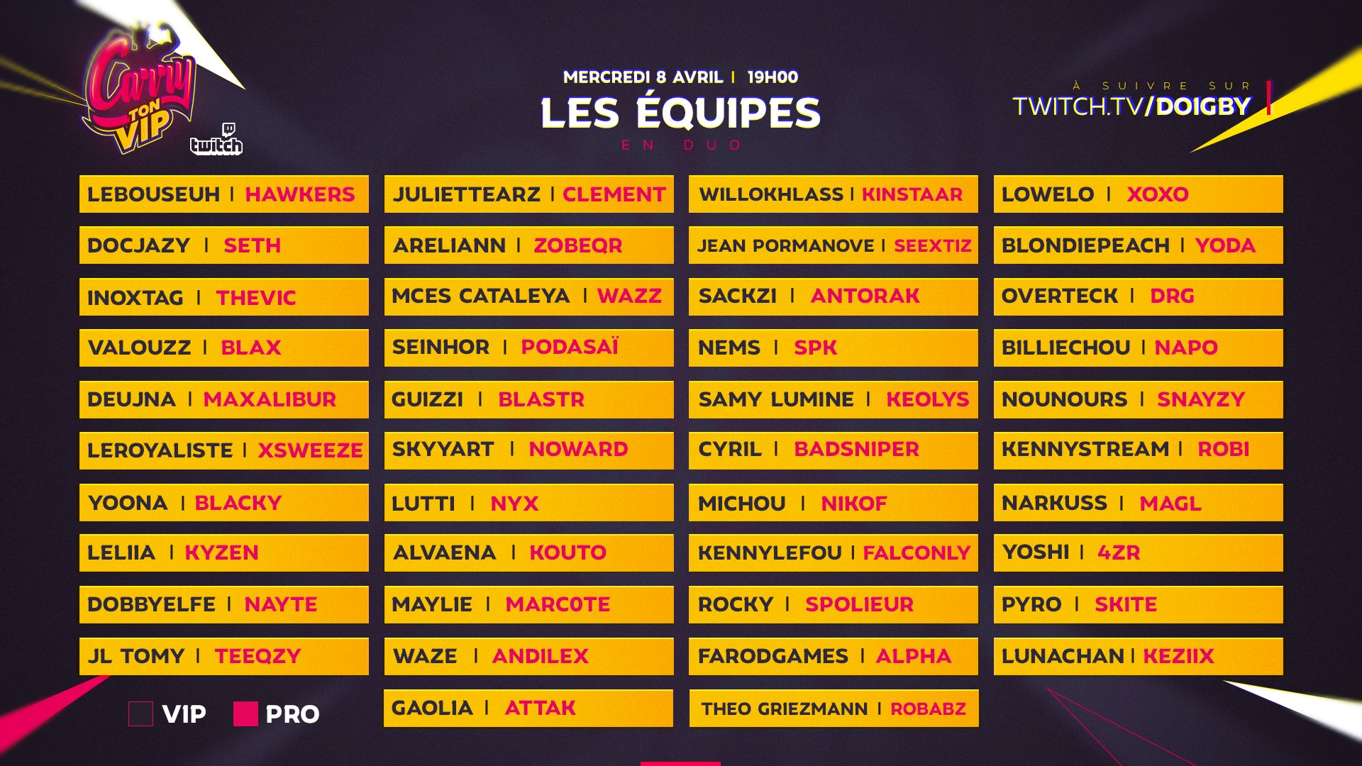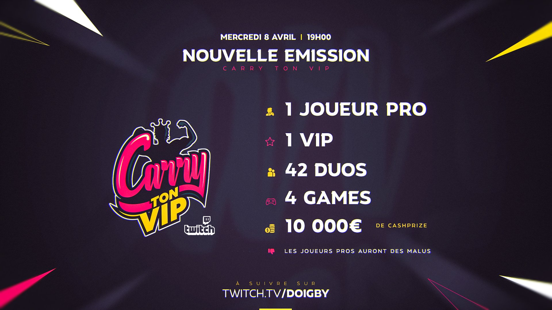 Ce dimanche, Doigby a annoncé sur ses réseaux sociaux le lancement d’une nouvelle émission : CarryTonVIP ! Le principe est simple, 42 duos vont s’affronter sur