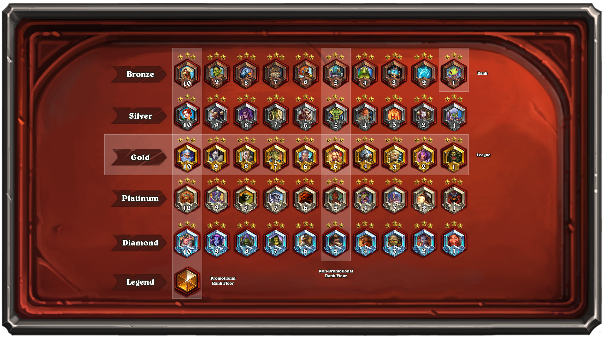 regroupera les meilleurs joueurs d’Hearthstone. Chaque division possédera 10 rangs avec trois étoiles et des paliers aux rangs 10 et 5 sous lesquels il ne sera pas possible de tomber