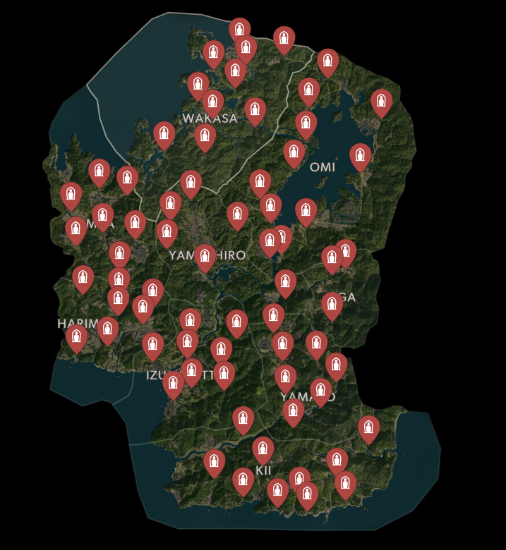 Tous les points de Statuettes de Jizo sur la carte d’Assassin’s Creed Shadows (source : Mapgenie)