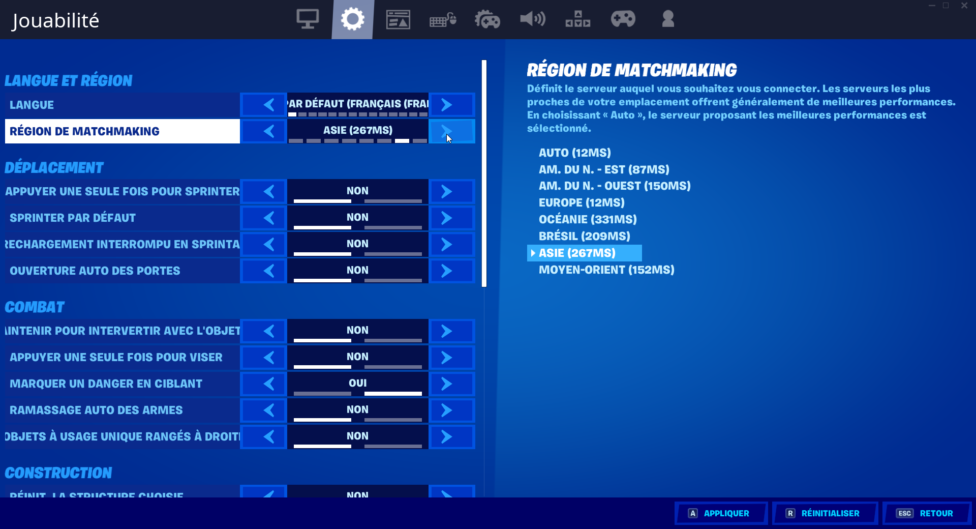 - Choisissez le serveur dans « Région de matchmaking », en cliquant sur les flèches.