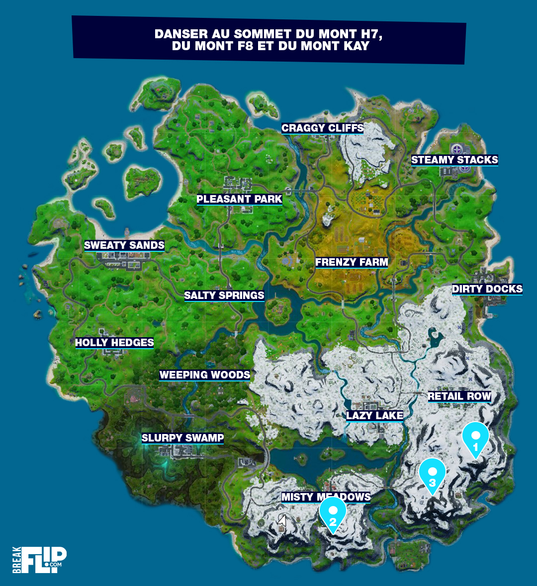 Danser au sommet du mont H7, du mont F8 et du mont Kay, défis Fortnite