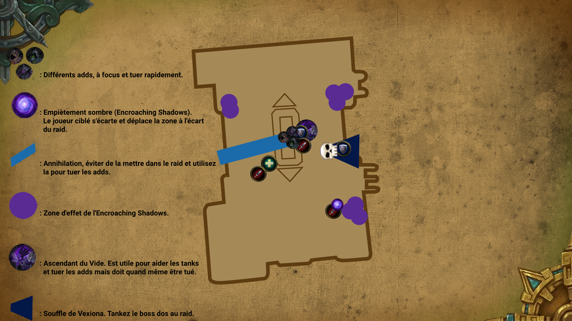 L’Ascendant lui doit être tanké à côté de Vexiona pour le descendre en même temps que le boss. Vous devrez tuer l’ascendant avant l’apparition des premiers adds pour permettre au tank d’utiliser