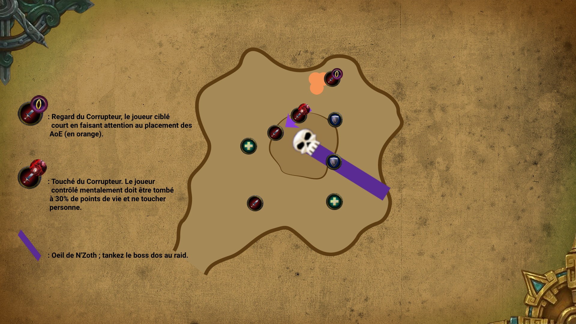 Exemple de placement en P1. Plus le fight avance, plus le combat va se compliquer. Ajouter à ça des Sangs de Ny’alotha après les P2.