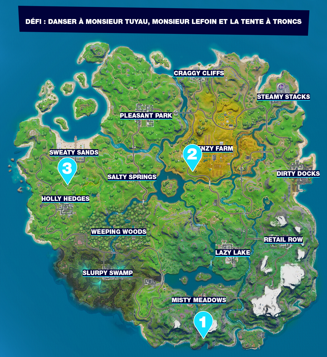 Danser à Monsieur Tuyaux, à Monsieur Lefoin et à la Tente en Troncs, défis Fortnite