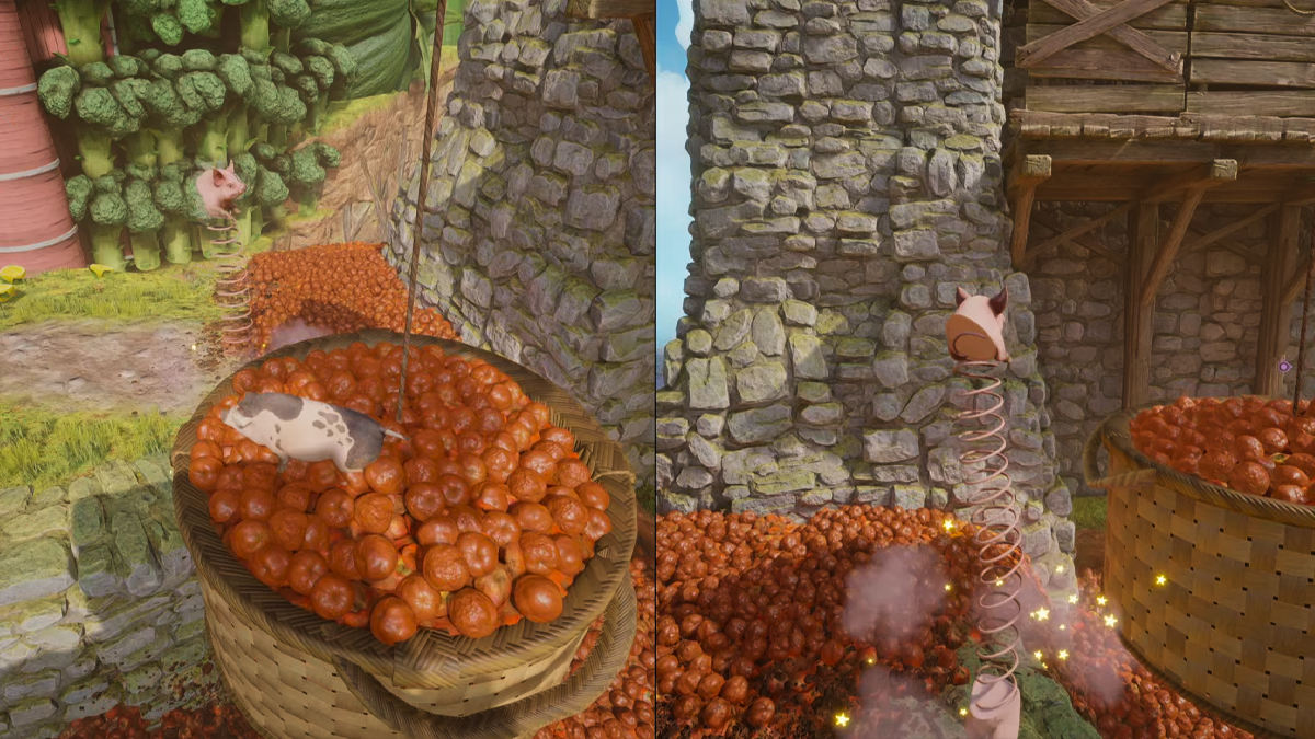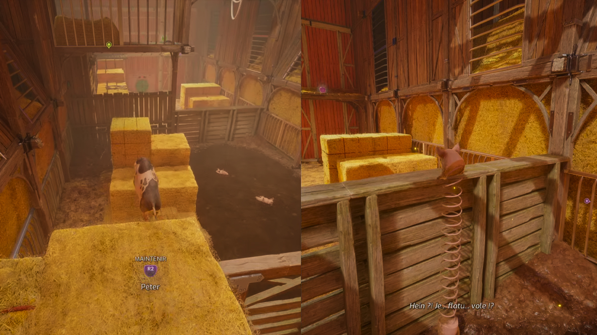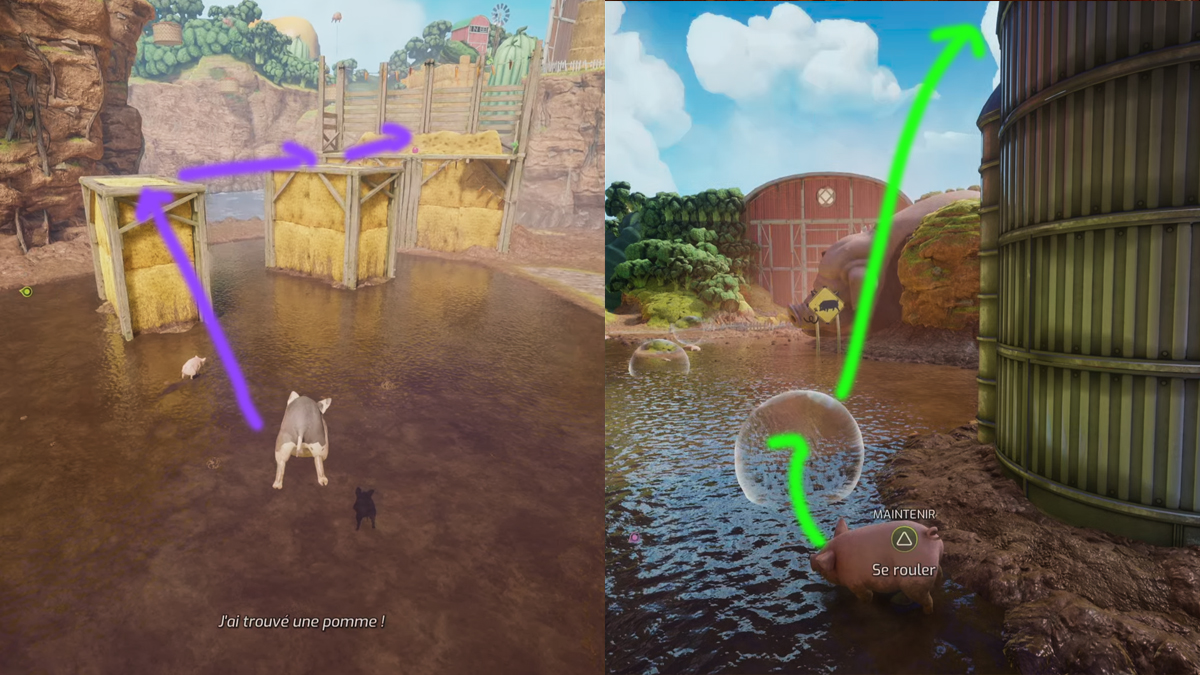Mio : Utilisez une bulle flottante à côté de la tour de foin pour vous propulser vers le sommet. Ensuite, enchaînez avec un pet-saut jusqu’à la tour suivante pour récupérer la pomme.