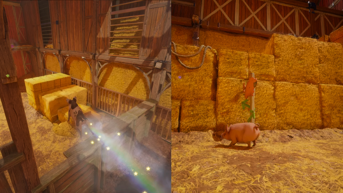 Zoe : Utilisez la fronde pour sauter et atterrir sur l’autre côté de la pelle, propulsant Mio vers une pile de foin circulaire où se trouve la pomme rose.