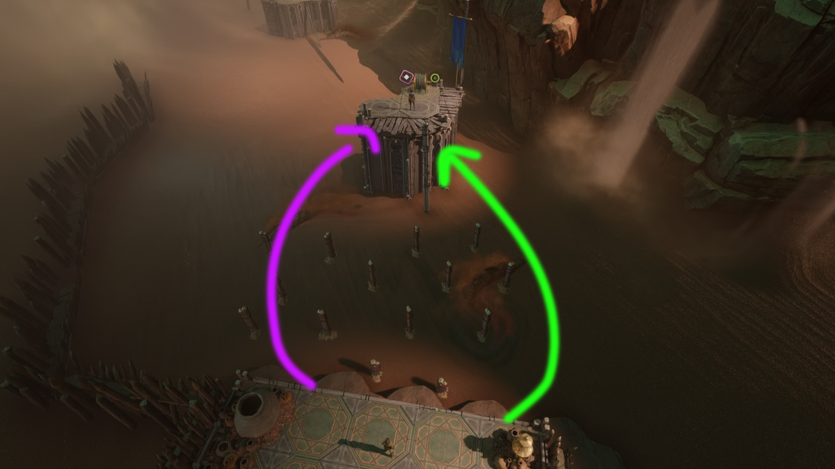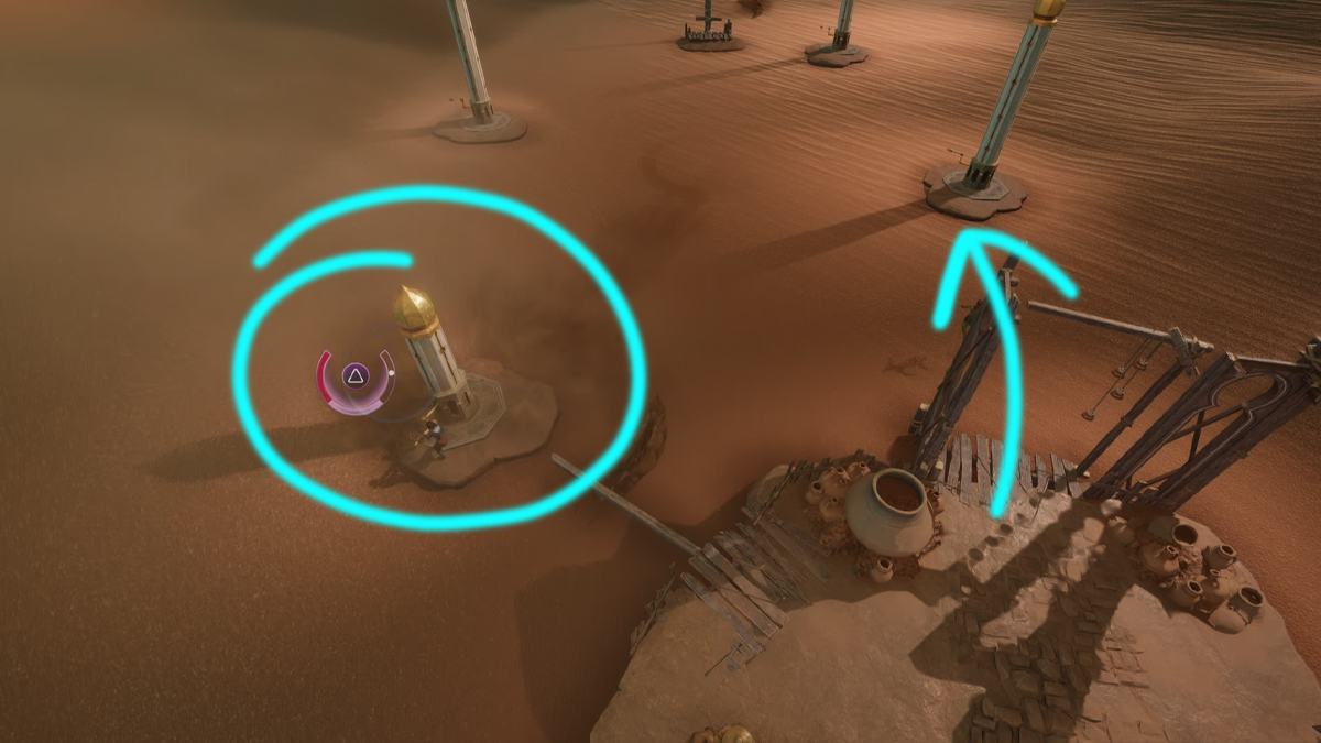 - Un joueur doit activer une tour en la frappant pour générer une onde sonore, attirant l’attention du Poisson de Sable.
