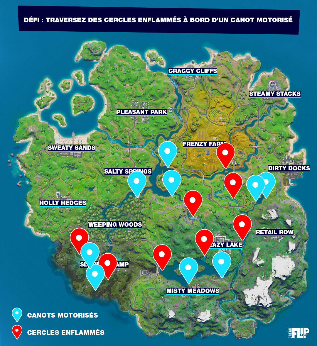 Fortnite : Traverser plusieurs cercles enflammés à bord d’un canot motorisé