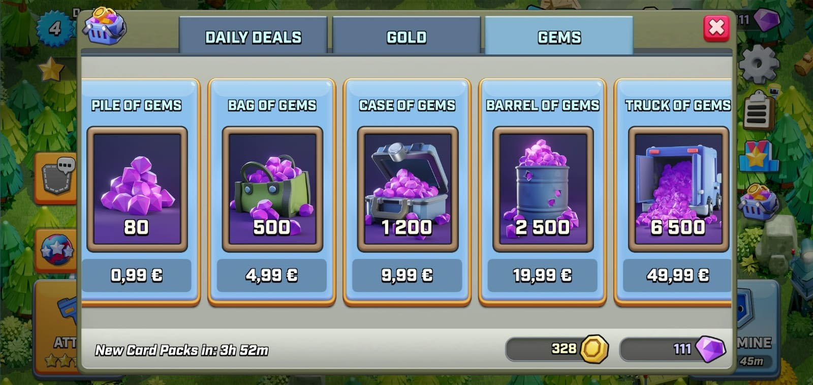 savoir quel pack est le plus rentable, ne vous inquiétez pas. Dans Rush Wars, plus vous allez acheter un pack cher et plus vous serez gagnant en terme de gemmes, et donc de pièces d’or.