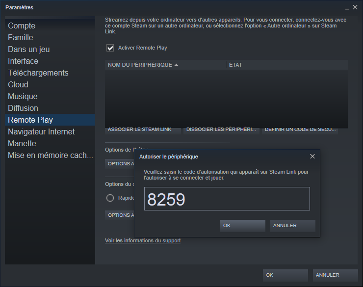 → Rendez-vous dans l’onglet « Remote Play » puis cliquez sur « Associer le Steam Link », avant d’entrer le code à 4 chiffres que vous a donné votre smartphone