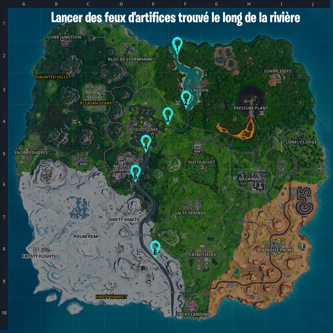 Les feux d’artifices se trouvent un peu partout sur la carte de Fortnite, mais toujours près des points d’eau. C’est donc là que vous devrez vous rendre pour les lancer et ainsi accomplir le