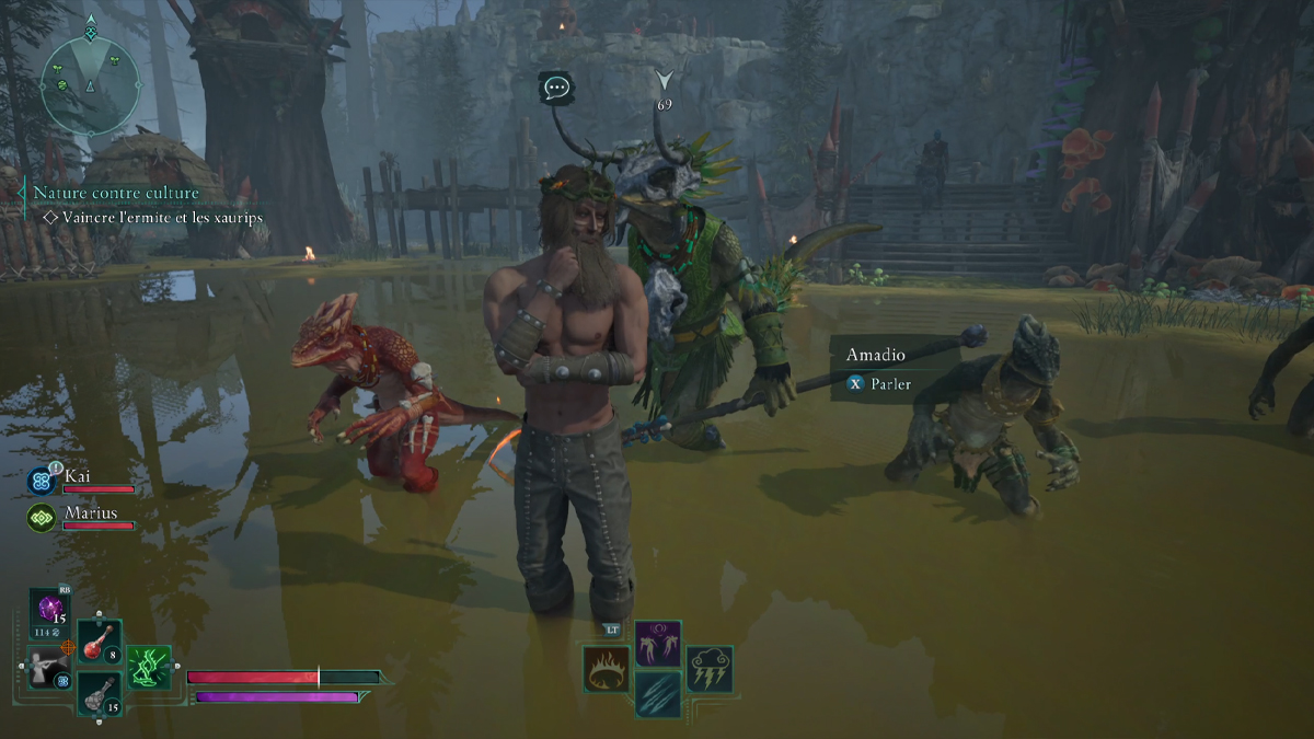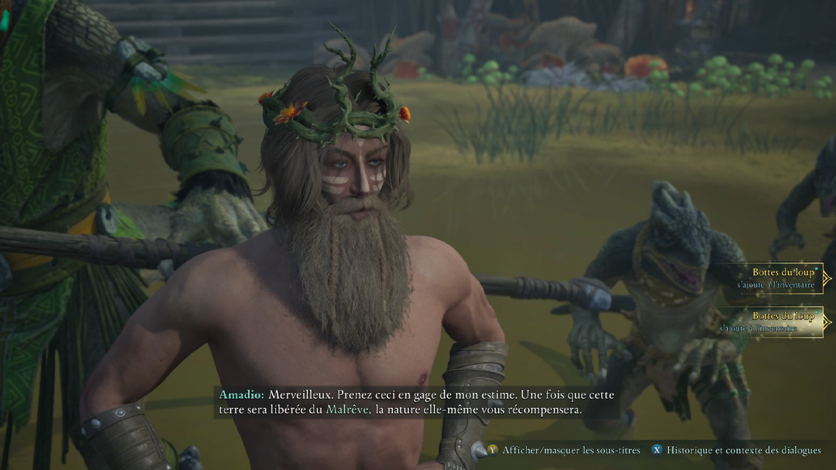 Sortez de la caverne et marchez dans la zone d’eau boueuse à proximité. Vous trouverez Amadio debout avec un groupe de Xaurips. Parlez-lui et il vous donnera les Bottes du Loup en récompense.