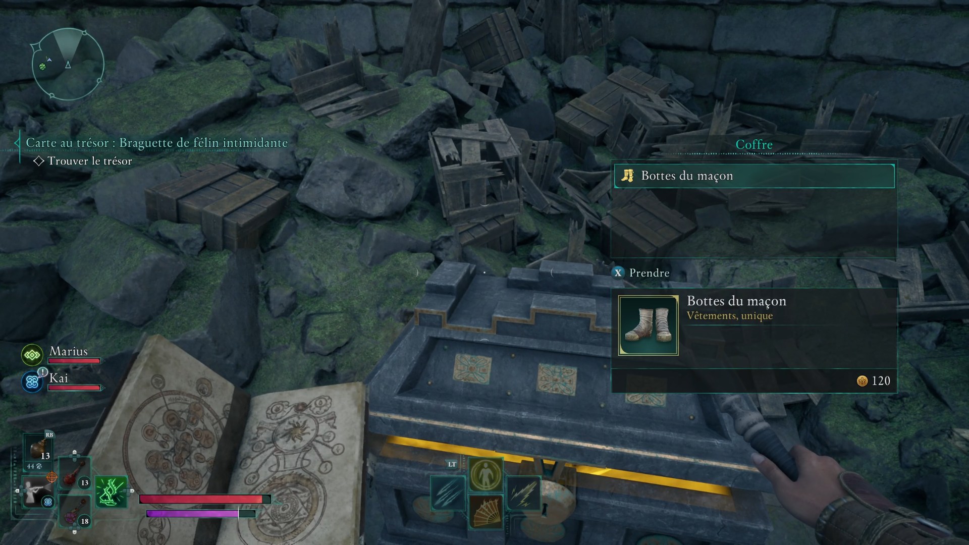 En ouvrant le coffre, vous allez obtenir les Bottes du maçon qui vous donnent un bonus de 10 % de distance d’esquive et +15 de capacité de transport. N’oubliez pas
