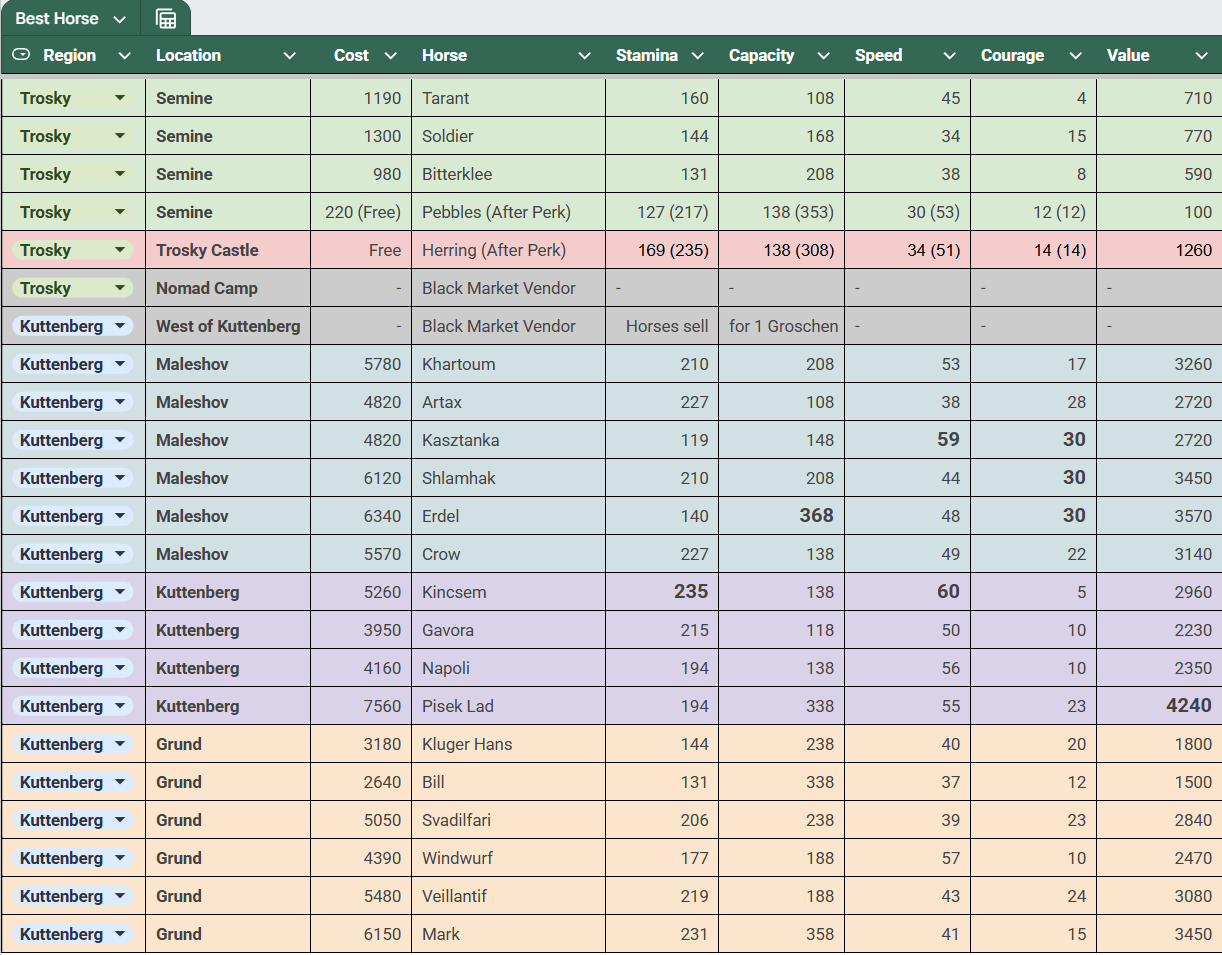 Voici la liste complète des chevaux disponibles et leurs stats (source) :
