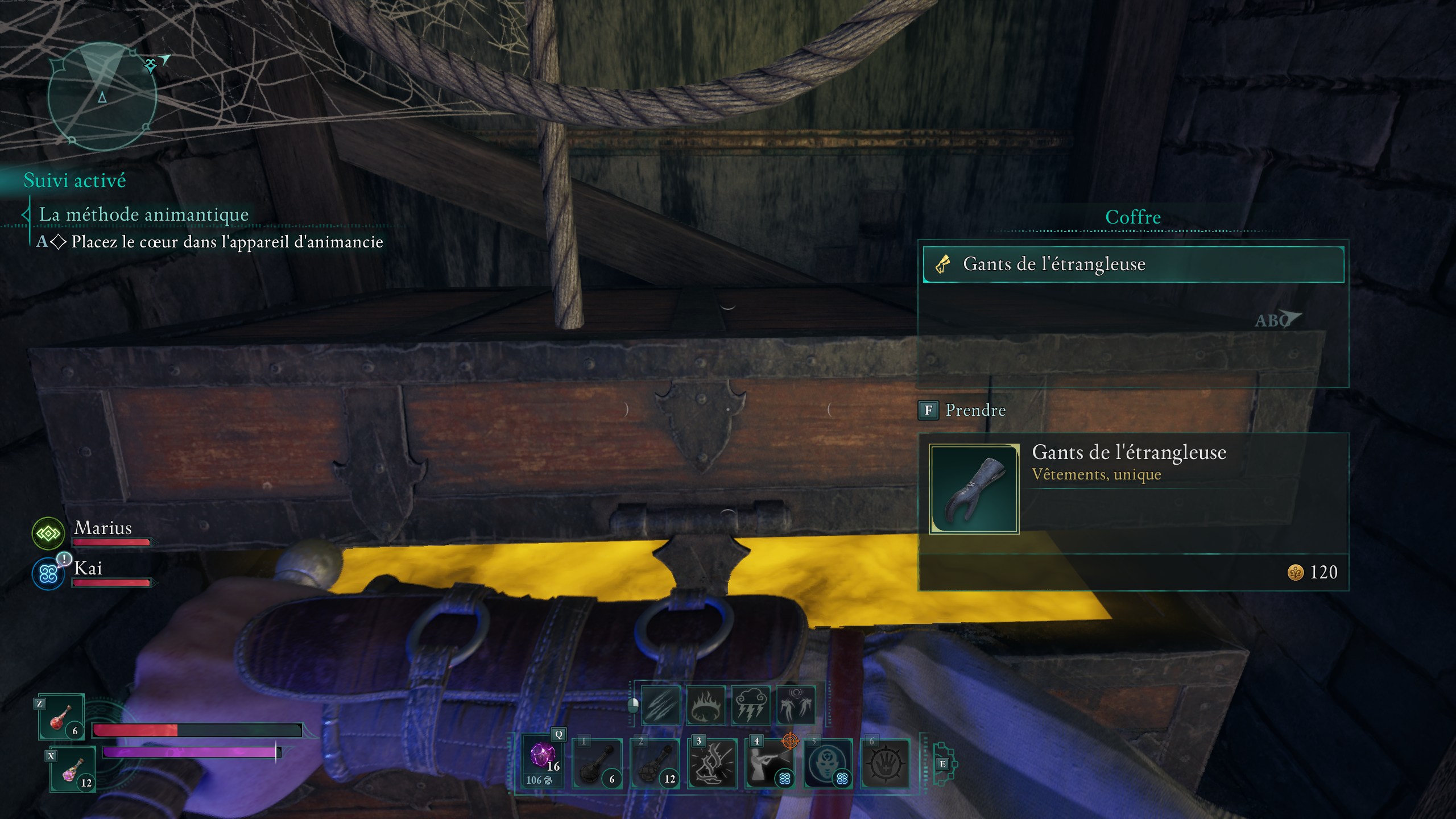 Le trésor est un vêtement unique, les Gants de l’étrangleuse qui vous donne un bonus de +15 % de dégâts d’attaque furtive, ainsi qu’une augmentation de vos chances de coup critique de 3